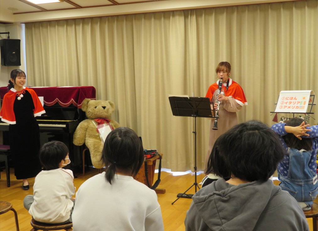 Nextアーティスト X‘masコンサート 12月13日 Nextアーティストさんが来園してくださり、クラリネットとピアノの生演奏で X‘masコンサートを開催してくれました。 クリスマスの素敵な演奏会のプレゼントをいただきました。 ララちゃんのハートフルツアー